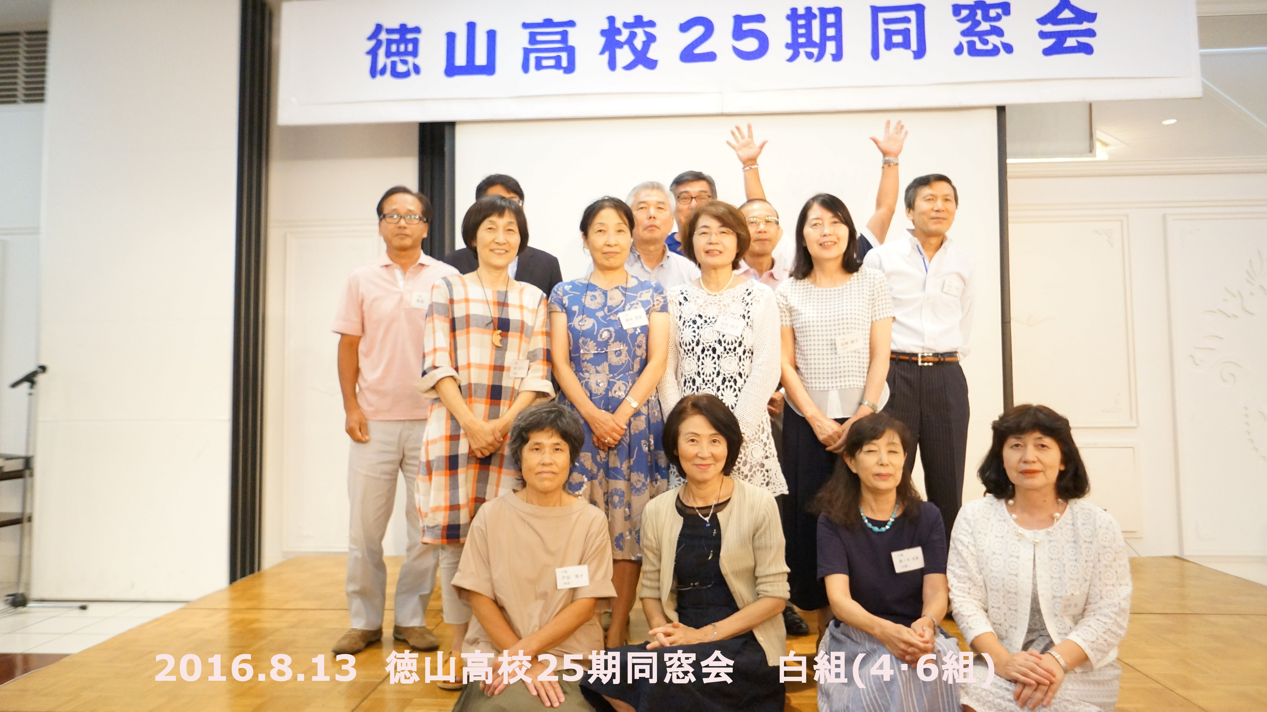 1列目 左から 戸田(多田)厚子、高木陽子、藤ノ木(立野)宏美、岩岡(浜田)操 2列目 左から 前田(兼重)冨士子、藤林(中山)登恵、河内(宮地)玲子、岩城(河村)頼子、佐井(山本)利信 最後列 左から 藤原弘、宮村幸一、井上良久、山本貴隆、松井清司、(手を挙げているのは原成伸5)