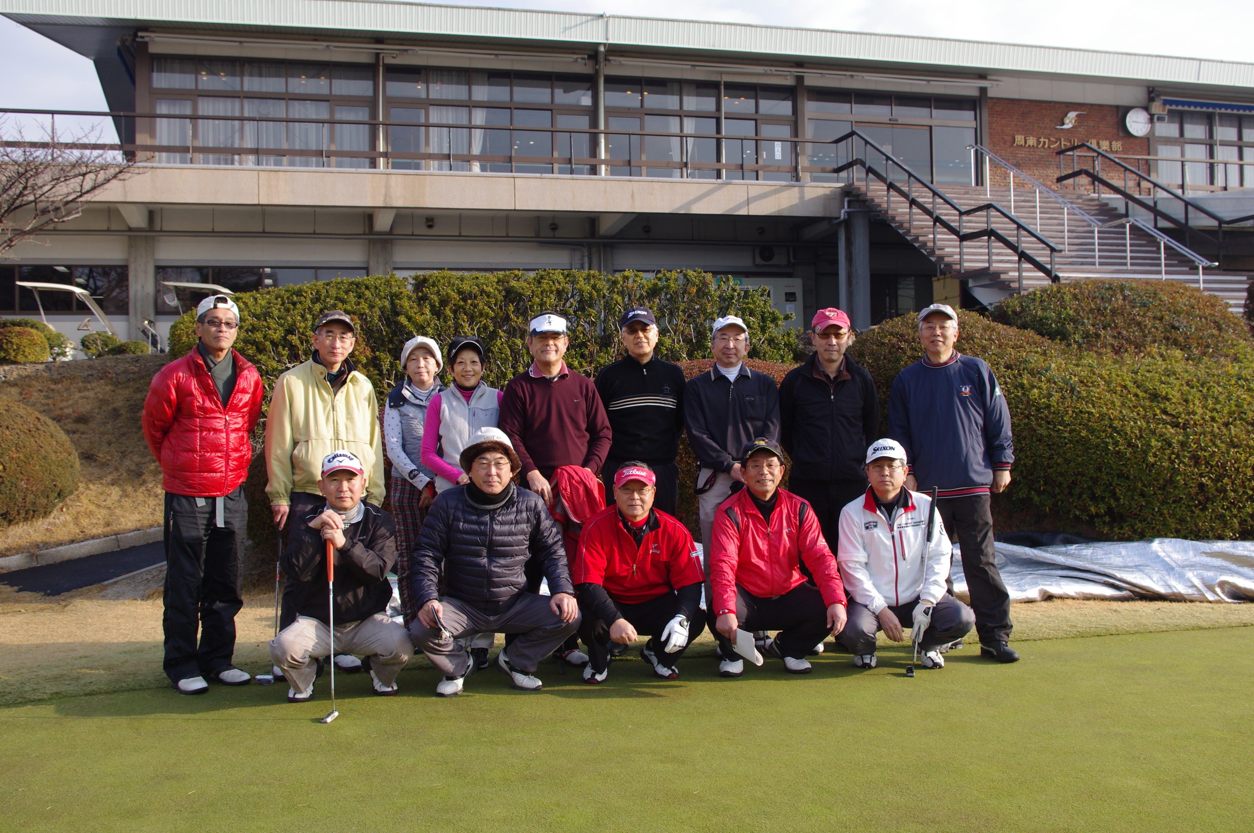 | 今年も恒例の正月ゴルフコンペが開催されました。今回は16人の参加がありました。 寒い中、還暦のおじさん、おばさんは元気です。写真は17人ですが、記念撮影のみの参加が1名でした ![]() |