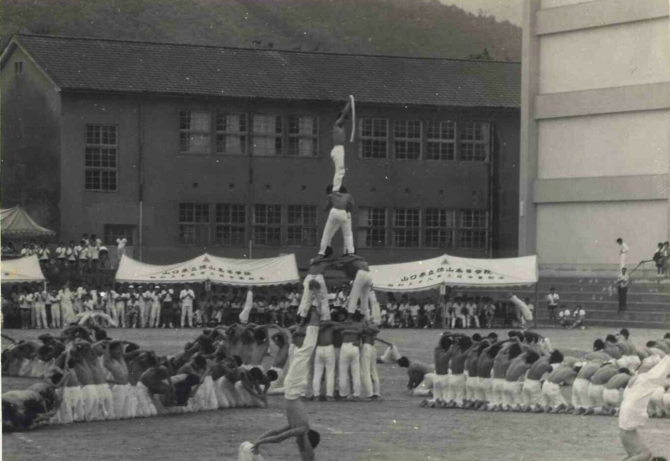 運動会組体操「琵琶湖就航の唄」。ハイライトの人間ピラミッドです。