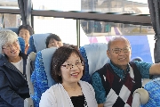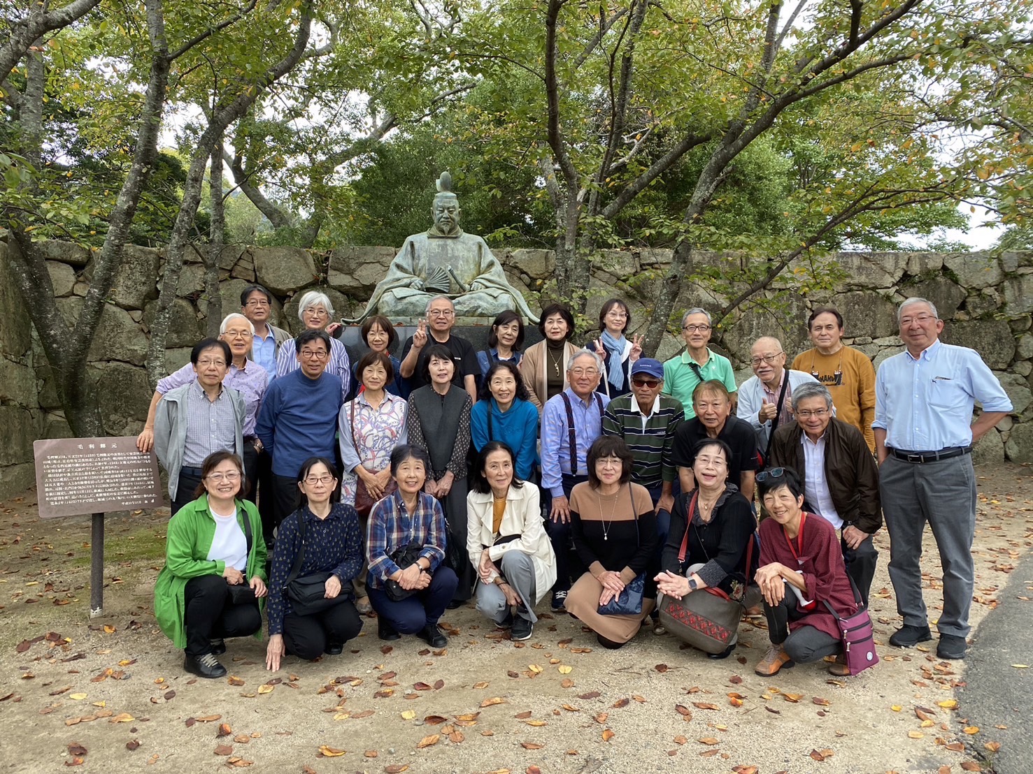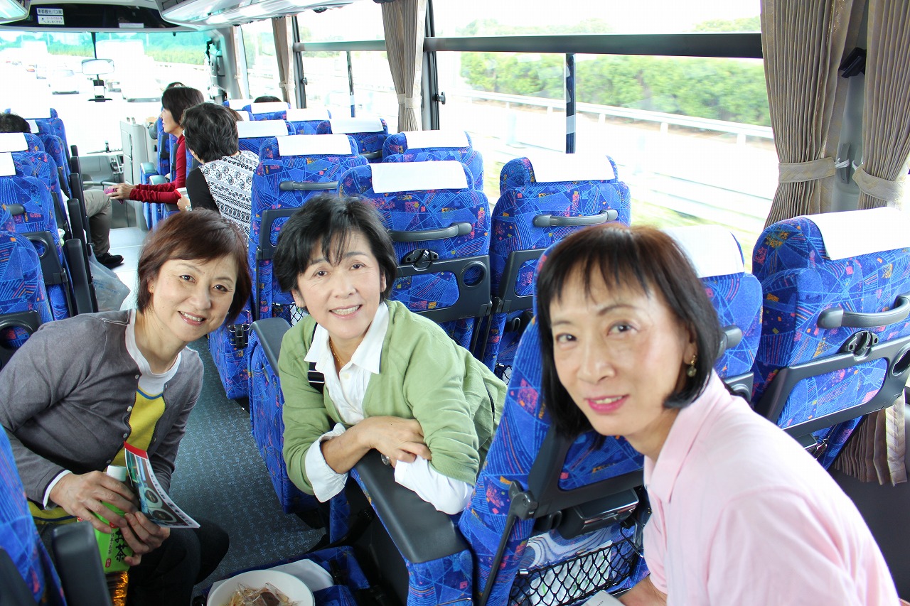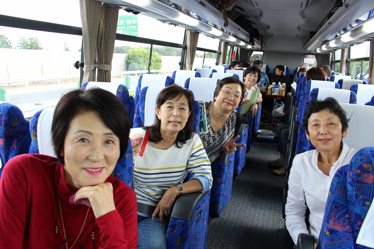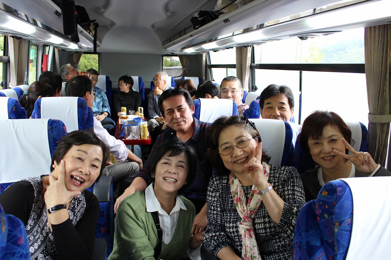 10月27日予定通り、午前10時に徳山を出発しました。出発時、男11人、女12人でした。新南陽駅で男2人、戸田駅で男1人女3人合流して、男14人女15人で高速に乗りました。
