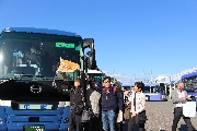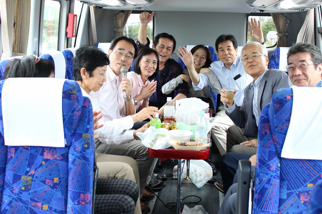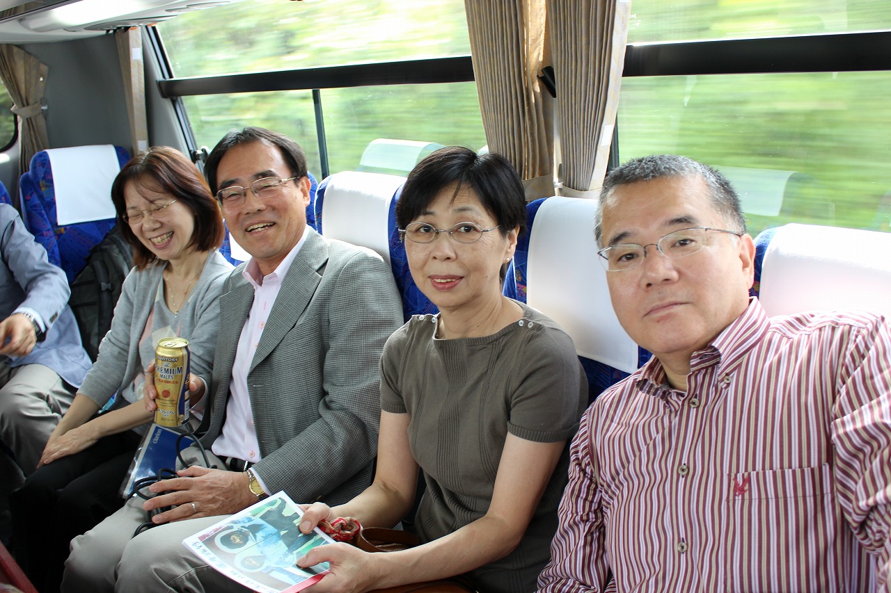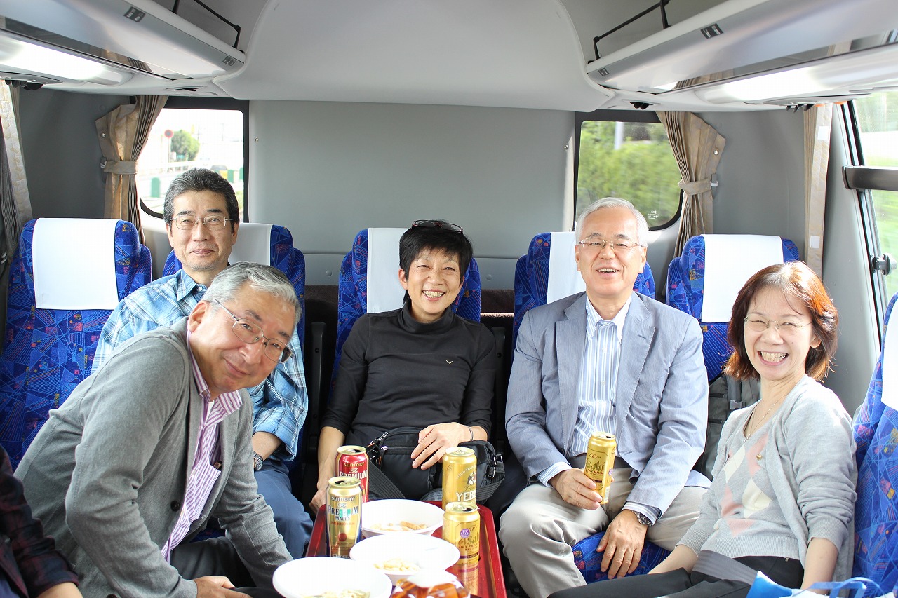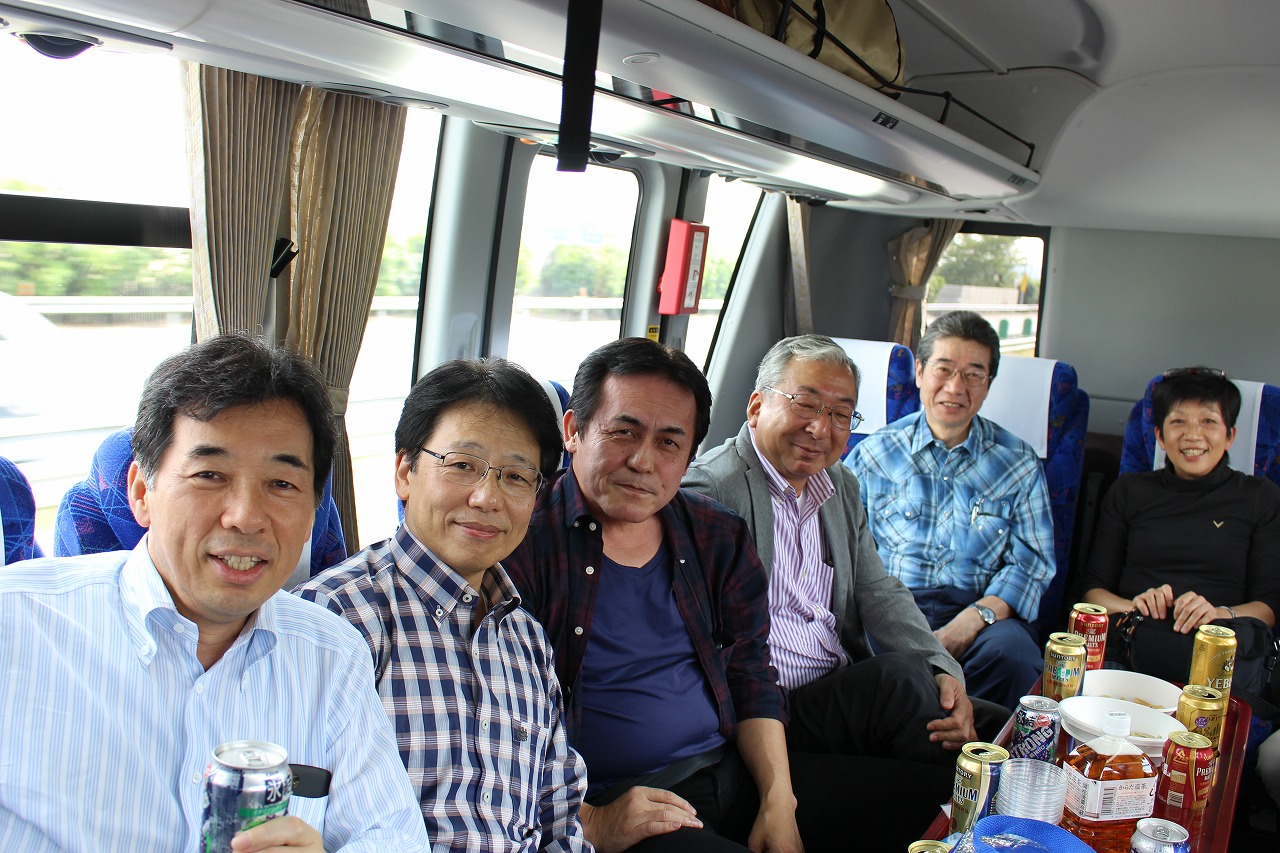 予定通りに12時50分ぴったりの出発.サロンバスを準備していて大正解でした. 日が高いうちからのアルコールは最高です(写真2). 山口から初参加のH君は早くも全開モード,ハイテンションは翌日の昼過ぎまで持続していました(でも,彼なりに気を使っていたことを, 皆お見通しでしたよ).