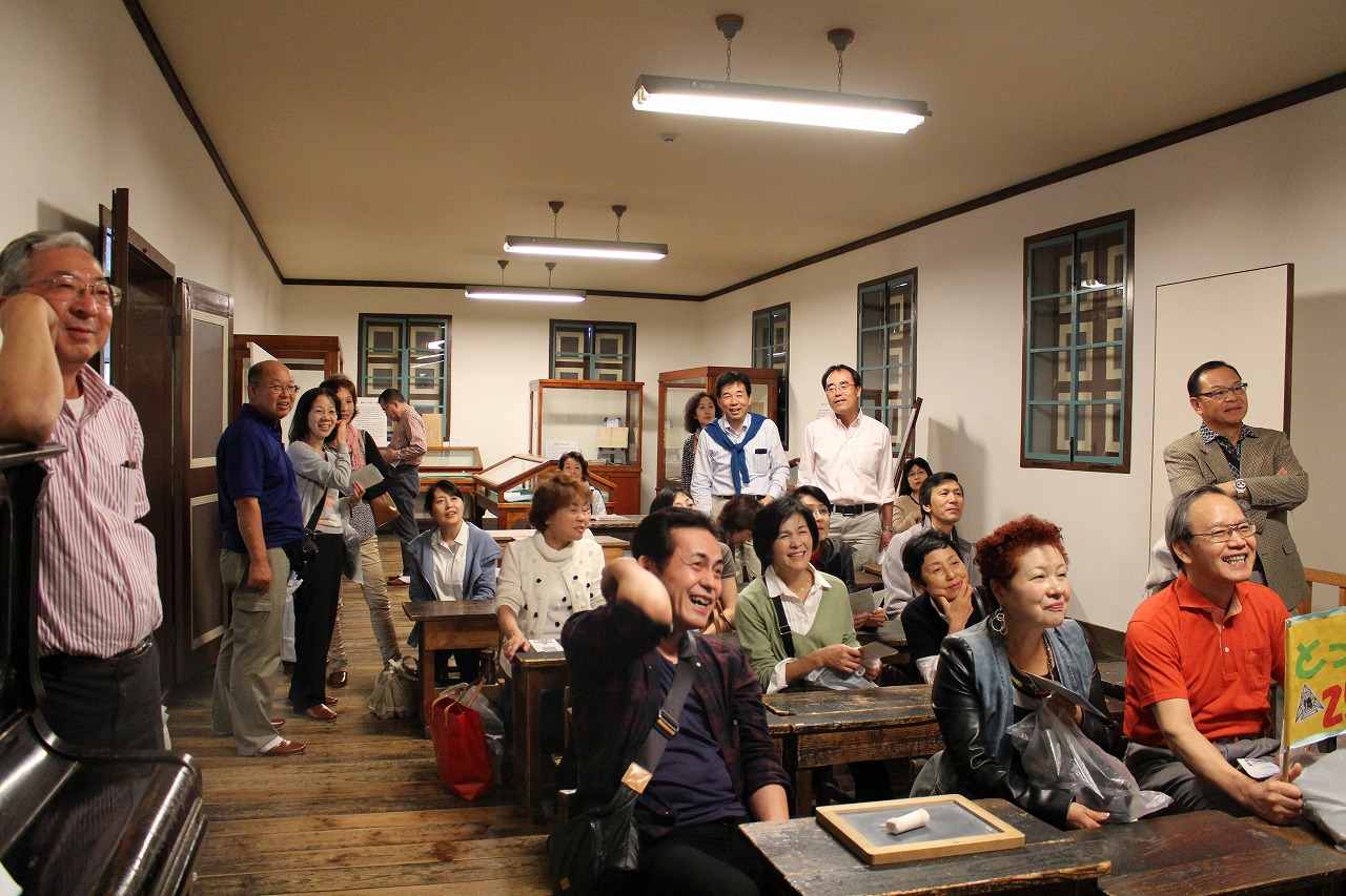 トイレ手作りの可愛い25期の団旗を振りながら、まずは重要文化財の「旧開智小学校」へ。この校舎はS38年まで約90年間に渡り使われていた、国内で最も古い校舎のひとつですが、東西南北の風見を配した八角塔がそびえ、舶来のギヤマン(ガラス)が散りばめられた凝洋風建築の洒落た建物です。使い込まれた傷だらけの、小さな木製のふたが開くタイプの机と椅子も懐かし〜い。中の教育資料は、何と10万点! さすが教育県! という感じです。「あまり期待してなかったけど、すごい! もっとゆっくり見たい」の声も聞かれました。