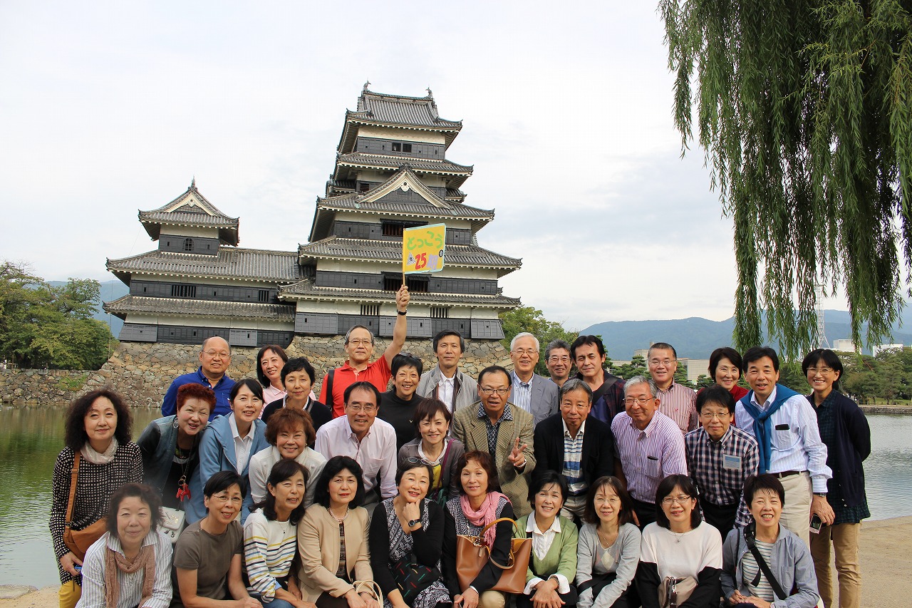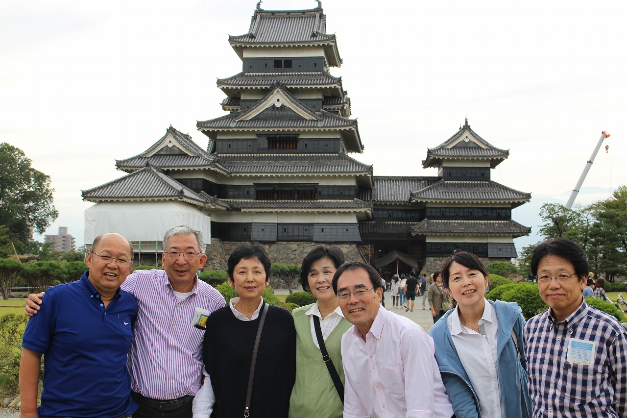 そして次は国宝「松本城」へ。階段が急なので、足もとに自信のない10名あまりは残り、他の皆は最上階の天守に上りました。あいにくの曇り空で、景色はいまひとつのようでしたが「ステキなお城だね!」の声に、松本出身のミスター清沢も、にっこり!!
