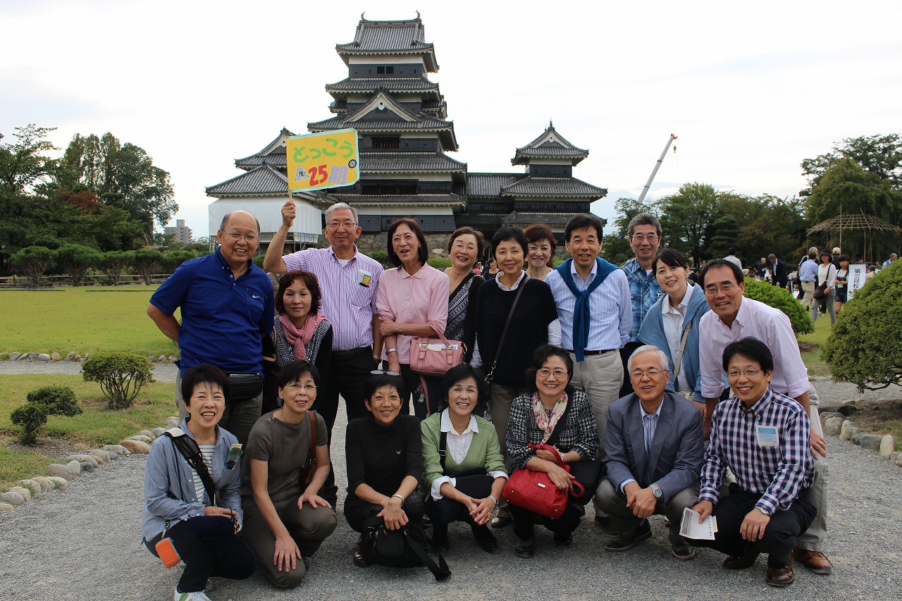 少し肌寒くなってきたので、お城を出て本日の宿泊先、浅間温泉のホテルへ。ここで仙台から参加のナベさんと合流。それぞれの部屋で(今回はクラス別)休憩後、大浴場で汗を流し(広い窓から見える信州の夕焼けがきれいでした)一応化粧をし直して、6時半宴会場に集合。まずは坂本会長のご挨拶です。25期同窓会の基盤を作ってくれ、亡くなって7年・・・今もなお精神的支柱である中村朗氏のこと、そして還暦の年の今日、ここに集うことのできた幸せに感謝しよう! とのお話でした。キョージュの乾杯の音頭で、宴会スタート!