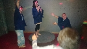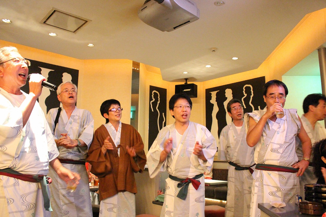 毎年恒例となった「すし詰めカラオケ」も一層激しさを増し, 室内温度を下げても下げても涼しくなりません. 加えて, H君が歌う「えも言われぬ替え歌」オンパレードに一同抱腹絶倒し, あっという間に予定の90分は過ぎてしまいました. Yさんは一生懸命カメラを向けていましたが, 写真が撮れません. 我々の熱気についにカメラも壊れたか, と思いましたが, 残り枚数を計算していなかっただけでした. 残念!これまた恒例となった, 肩を組んでの「遠い世界に」を歌い終えて, 三次会へと移っていきます.