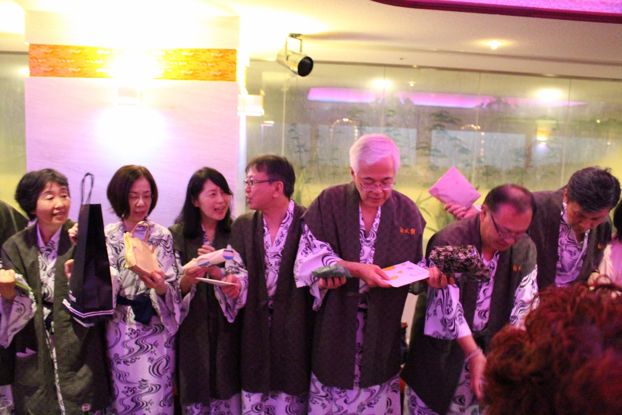 再び男性に戻り東京組のアダッちゃん・関西組のユウちゃん・イトちゃんでスピーチも終わり、中締めは前回世話役のマッちゃんからの挨拶。2年後の同窓会旅行の世話役の紹介があった。全権委任されるので、世話役が「次はハワイで」と言ったらハワイでするのだそう。