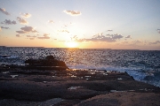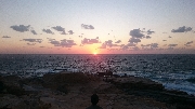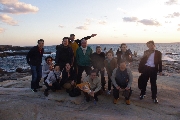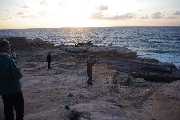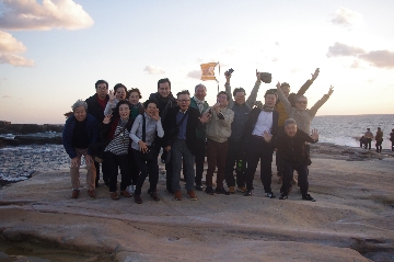 岩場の撮影スポットまで下りて写真撮影を済ませ、戻ってみると夕日は西の水平線の少し上。みんな岩に腰掛け、あの夕日が水平線に沈むまでは梃子でも動かない、といった風情。