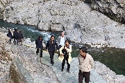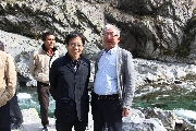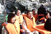 バスの中から見える山々と深く長く渓谷が続き、山口の山の中と違います。受付から船着き場まで、十何メートルも下りてゆくのですが、階段の下り口あたりに”ここまで水がきたことがある”なんてことが書いてありました。(びっくりです)降りてゆく眼下に見える川の水、すばらしい透明度です。船着き場近くには、大きな魚が、餌を待ってゆったりと泳いでます。