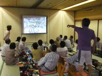 ホテルに到着し,いよいよ宴会スタートです.その目玉として, 高校時代の懐かしいスライドショーを行いました(写真5, 6). セピア色に変色していた写真や, カラーとはいえないような(?)写真(写真7, 8)も提供されましたが, 昭和46,7年当時は白黒からカラー写真に移り変わる転換期でもあったことが改めて思い出されました. 高校入学から卒業にかけての「あの頃,君は若かった」映像に笑いが絶えない一次会となりました.みんないい笑顔ですね(写真9)!