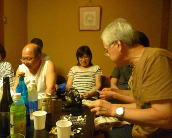 一部の七夕メンバーに早めに集合してもらい、アルコール類の調達をお願いしていたのですが、ゾロゾロとコンビニに行く後ろ姿は、はや嬉しさを隠し切れない60歳!!そして掲示板に書き込んだ、例のけしからんメールの差出人も現れました。「あのメールはいかん! アイツを真っ先につぶせ!」というキョージュの指令が出たので、ブチ殴るのはやめましたが・・・。