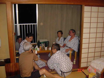 夜11時を過ぎて、男子部屋に三次会の舞台を移します。当初準備されていた5人部屋の隣に別のグループの部屋があることが分かったので、急遽、4人部屋に変更しました。少し狭くはなったのですが、結局、温泉の二度入りを楽しむ人以外全員が集まってきて、立錐の余地もないほどの缶詰め状態です。旅行を始める前の心配事項の一つが、アルコールが足らないのではないか?ということだったのですが、杞憂だったようです。宴会で飲み足らなかった方、カラオケでエネルギーを使ってしまった方ののどを潤すワイン、ビール、日本酒、焼酎…みなさん、本当によく飲まれますね。話は尽きず、午前1時も過ぎようとしたので、漸くお開きになりました。ストップの声がかからなければ、延々と続いていたかも。(写真9)