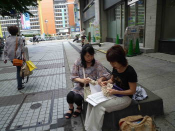 集合場所は新宿駅西口. 写真1はYさんと原田さんが、新宿の路上で会費を徴収している信じられない光景です。無事に集金できてよかった!