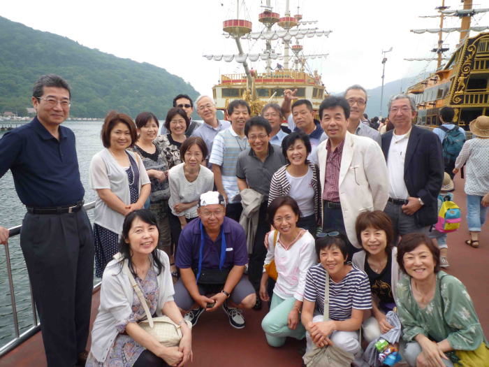 バスはいよいよ「箱根」へ. 正月の大学駅伝往路の名物コースをバスの中からですが,実感できました.強羅から早雲山まではケーブルカーで移動. そして, 早雲山から大湧谷までのロープウェイからの絶景を堪能しながら, 大涌谷へ到着しました(写真3). 一個食べると7年寿命が延びると言い伝えられている名物の黒玉子をたくさん買って, 芦ノ湖遊覧へとさらに移動. 海賊船に乗り込む前の全員集合写真です(写真4).写真を撮ってくれた20代のカップルに「高校卒業40年目だよ」と説明すると,「素晴らしいですね」と言っていました.